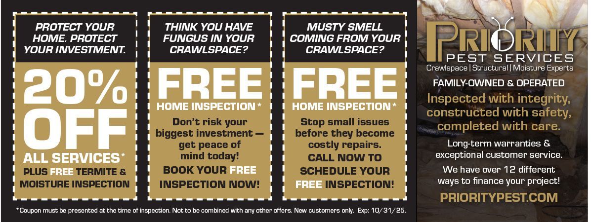 Call Priority Pest Services for a Free Home Termite, Pest & Moisture Inspection. We will inspect your home for termites, roach infestation, ants, spiders, mice, rats, other rodents and pests. This includes a crawlspace and attic inspection to check for moisture and insulation problems!
