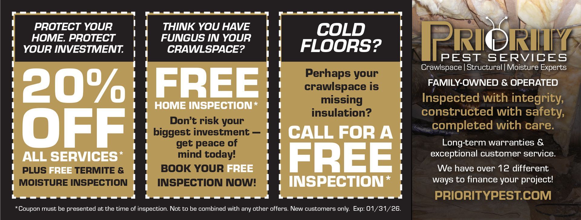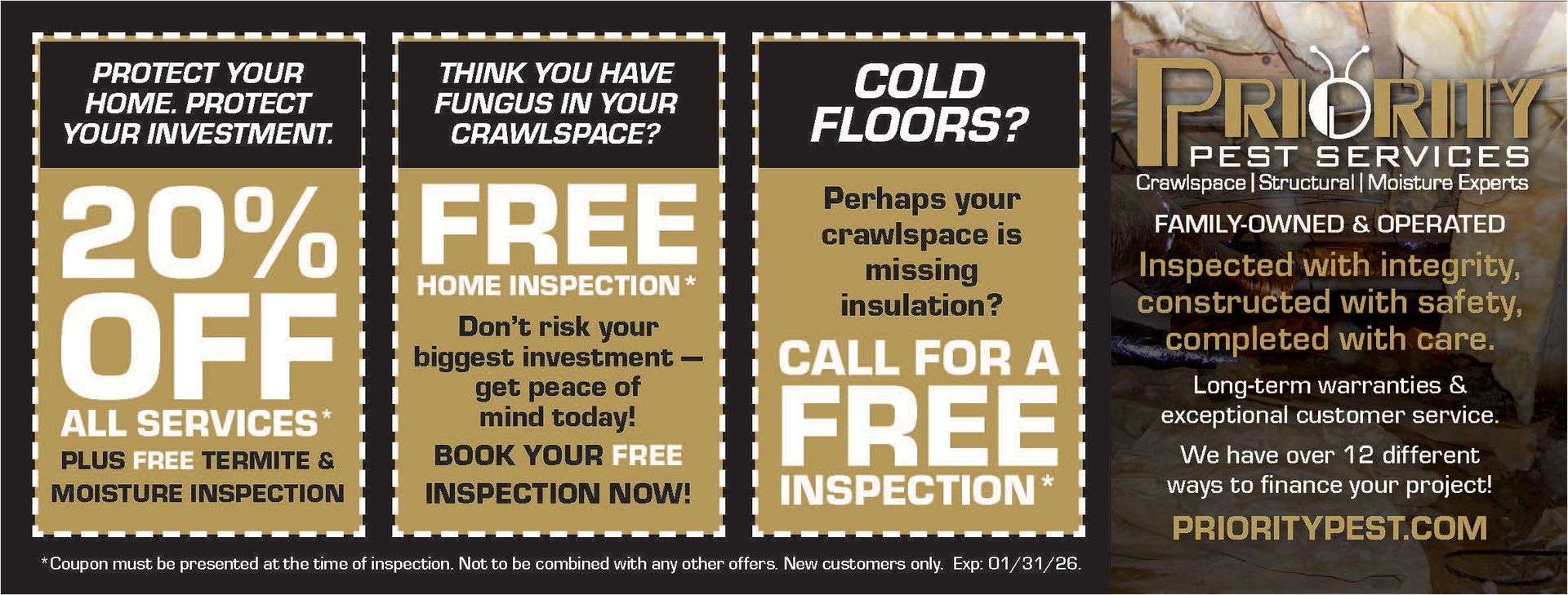 Enjoy these valuable discount Pest Control Coupons for pest control, termite treatments, moisture control, home repairs, and other services from Priority Pest Services!
